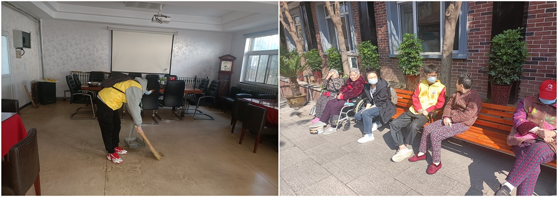 志愿者到达幸福家园敬老院后,帮助敬老院的工作人员们打扫卫生,为敬老院增一分洁净。随后,志愿者们与老人们交流聊天、听老人讲红色故事,体会革命先辈们的艰辛、传承红色基因。志愿者们还陪老人进行下象棋、打麻将等娱乐活动以放松身心。志愿者们的到来不仅给敬老院的老人们带去了心灵上的温暖,还进一步传承了尊老、爱老的中华民族传统美德,同时志愿者也在老人描述的经历中学习到了社会经验,使整个院内洋溢着温馨、祥和的气氛。